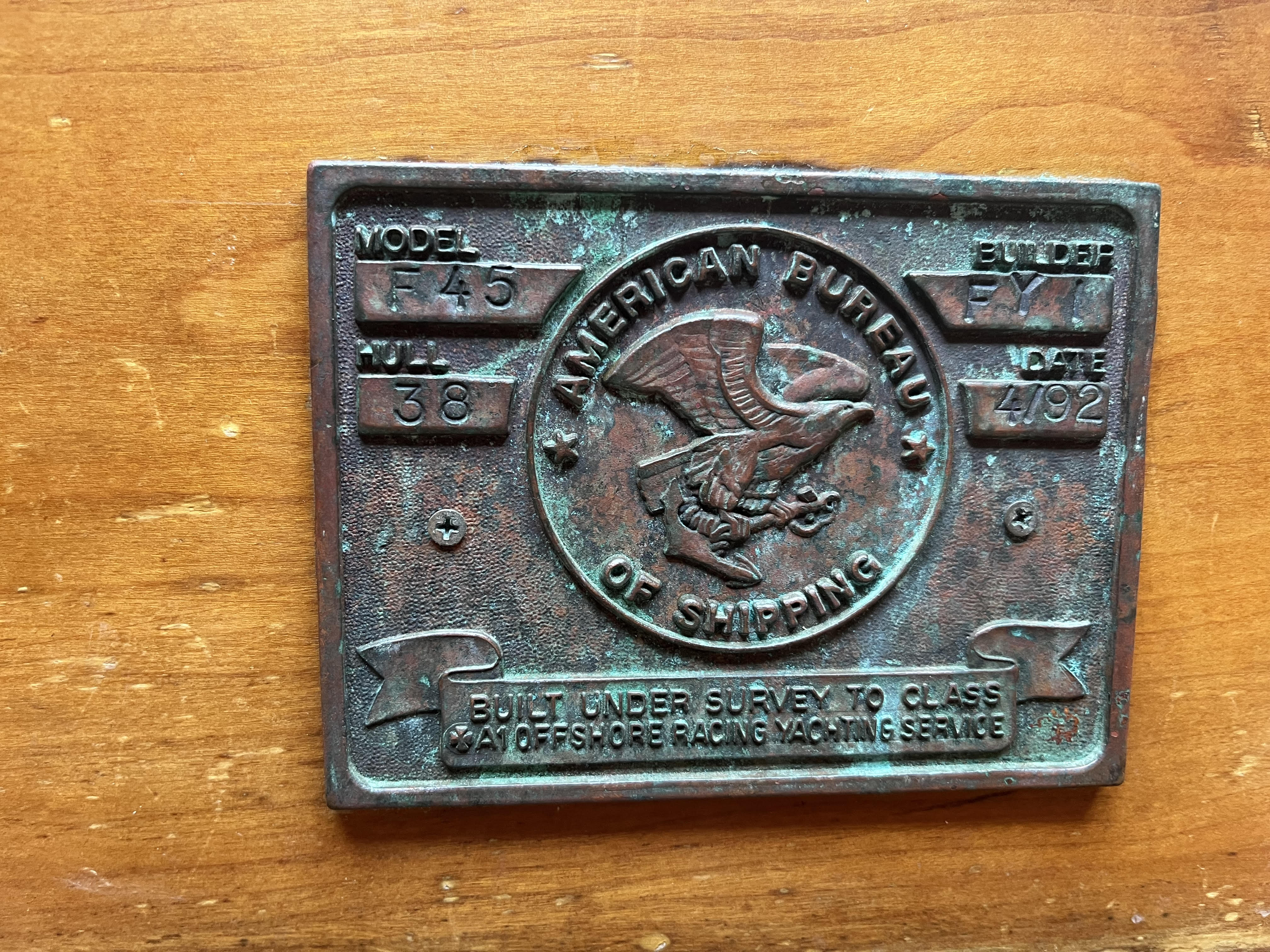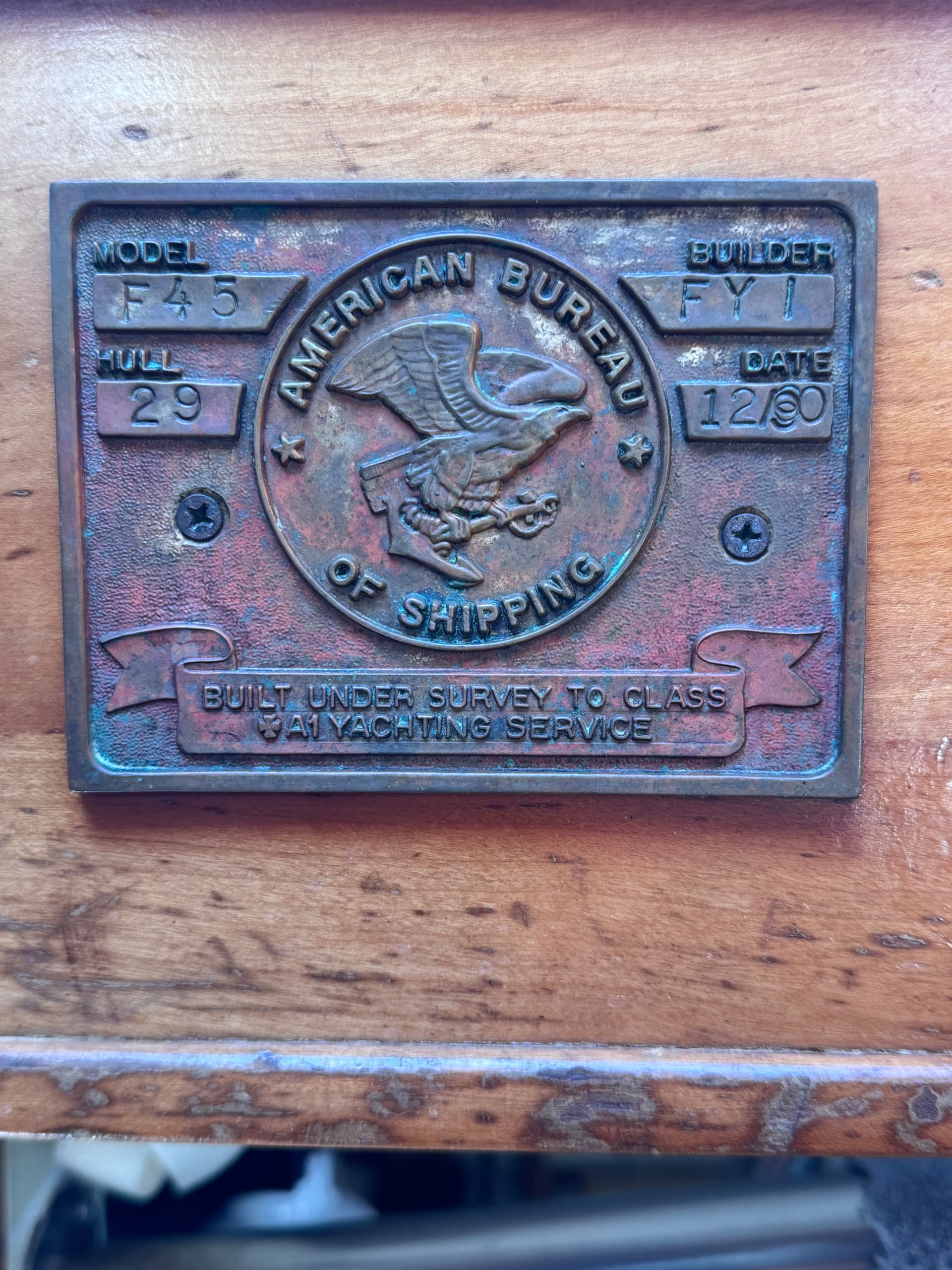 A photo from the previous owner of my '91 45 CC shows a Freedom plaque on the coaming near the stern. (That locker above it is aftermarket.) The plaque was not there when I purchased the boat and I would like to replace them. I assume there was one on each side. Does anyone know how I could get my hands on a couple of these?