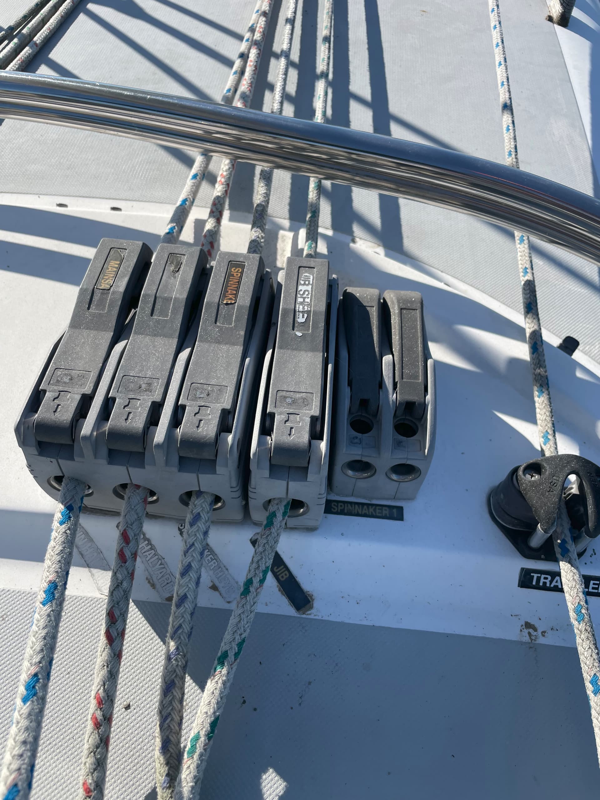 Clew lines, along with the jib/spinnaker halyard and 2nd reef line are on the left.