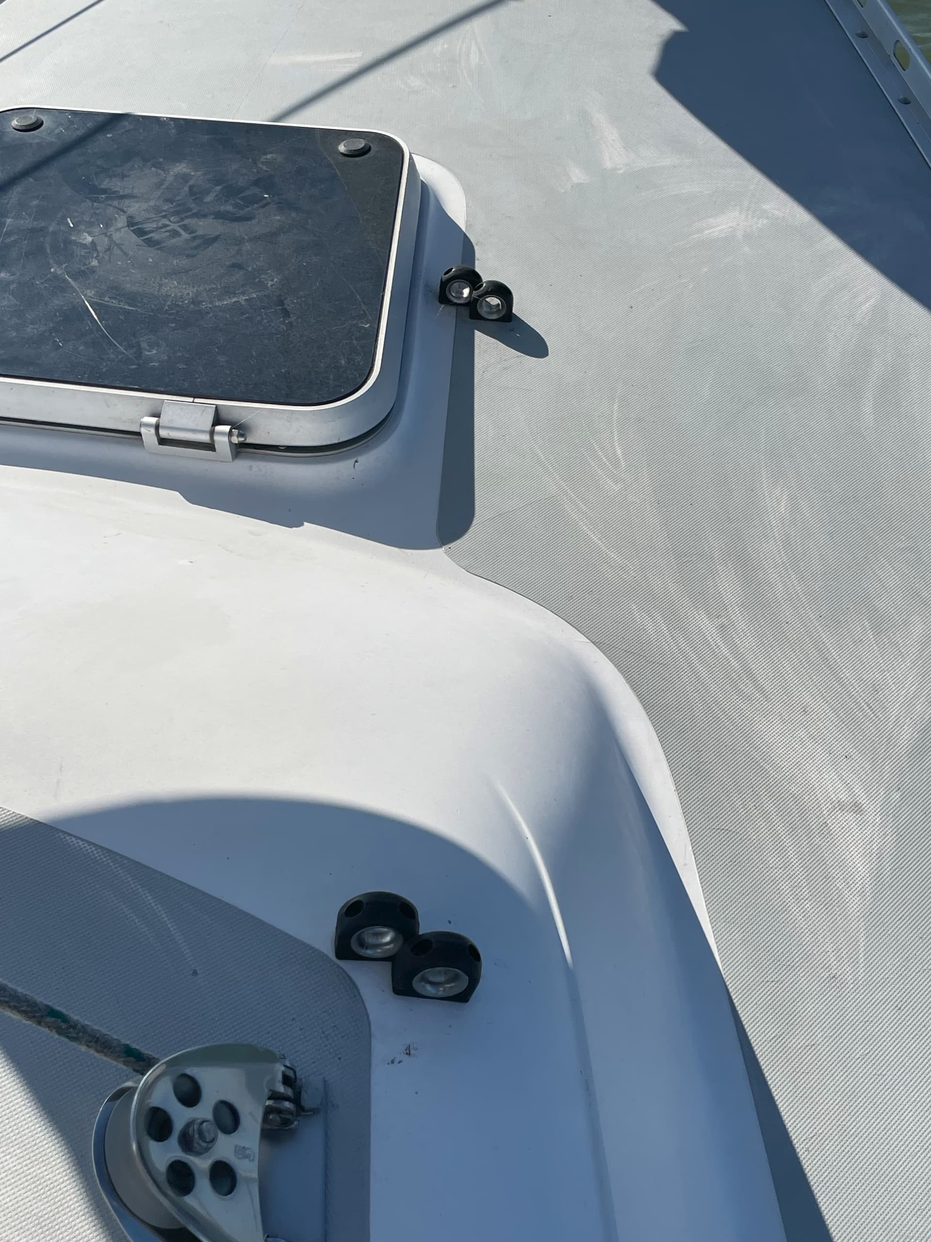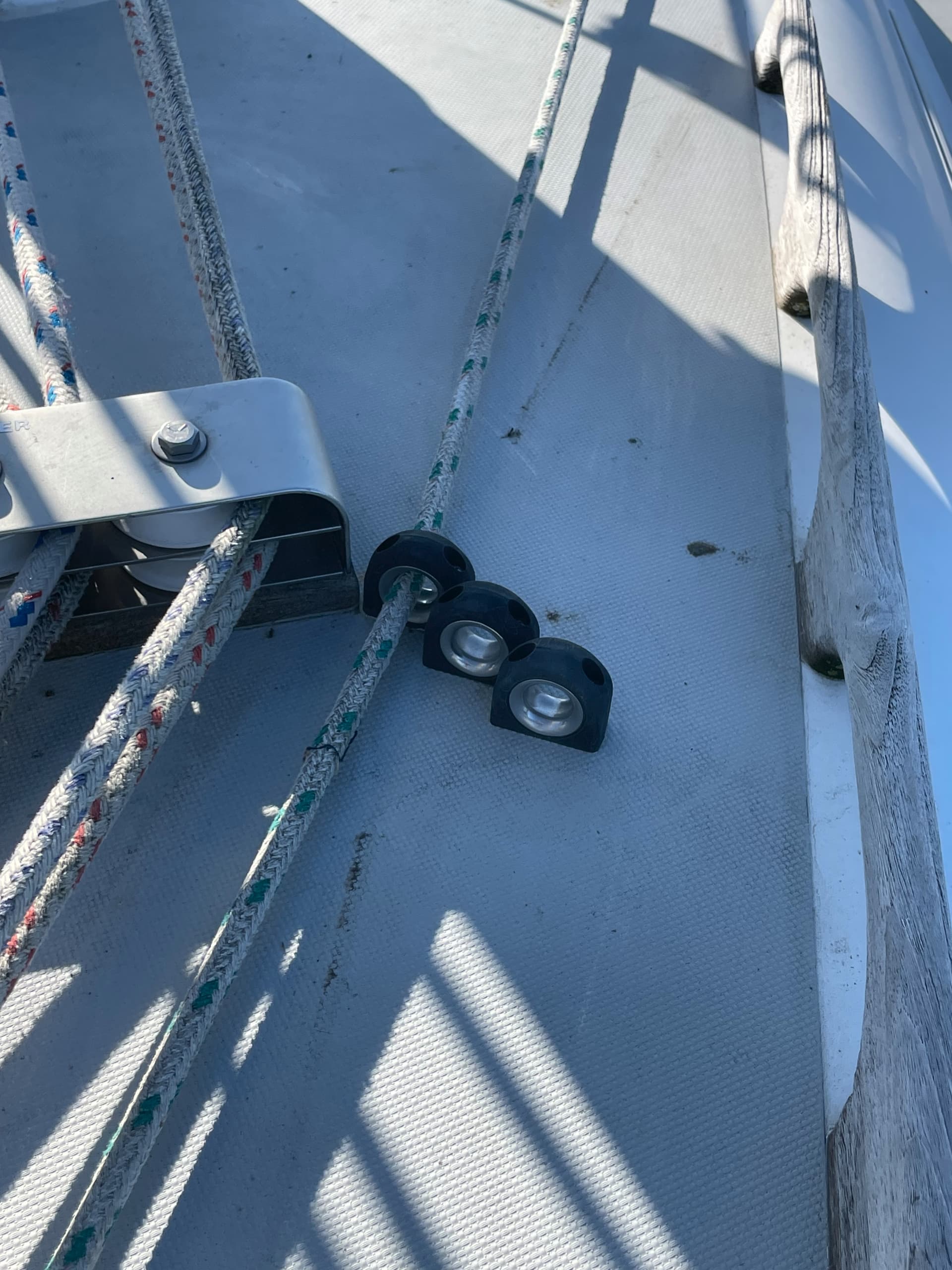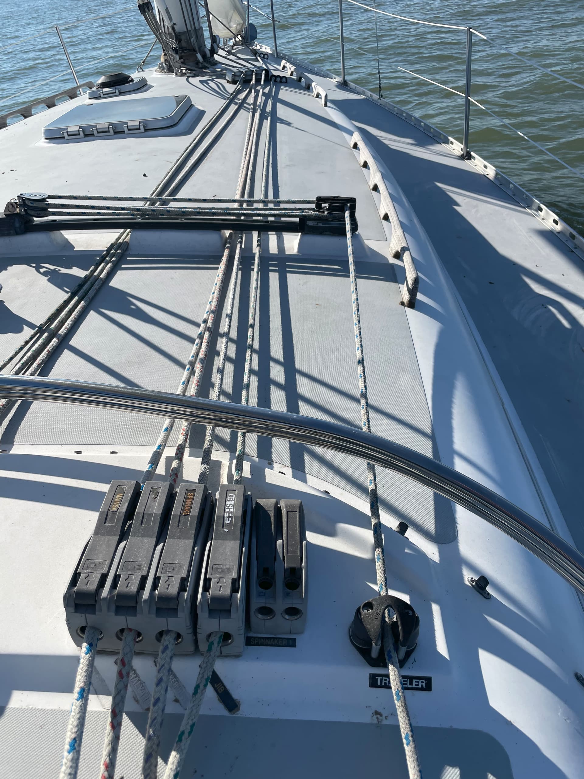 I’m asking for photos of F36/F38 cockpit set-up because of the unique deck molding and the angles for a lead to the nearest winch. The F36/F38 have an asymmetrical cabin top at the cockpit, with the entry hatch to port and all the rope clutches and both winches on the starboard side. My rope clutch row has indications of old filled holes and some rearrangement of the lines in the deck organizer by the mast. I don’t seem to have room to starboard to mount a double rope clutch in line with the rest of the clutches due to the molded in curve of the raised breakwater where they are mounted. Don’t know if I need to put the spinnaker clew line double rope clutch further aft on the lower level where the winches are mounted or if I need to remove and remount half the existing rope clutches.