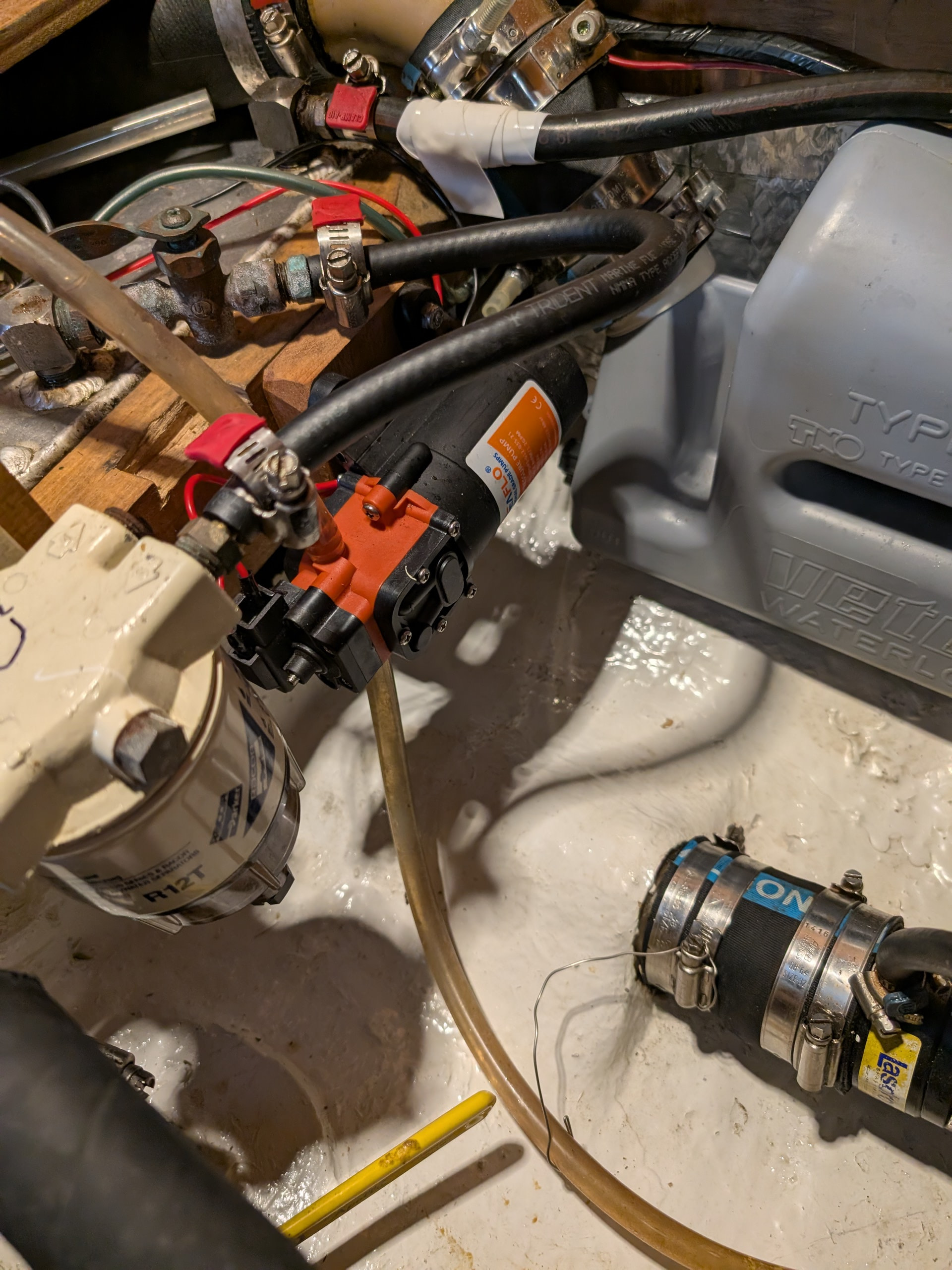 So this works really well and I can hook a silicone tube (which is routed from shaft well under the engine to the bilge) to the pickup barb to clear the last bit of water out of the main bilge whenrver I want to. It is really handy as opposed to sponge drying the bilge…I am fanatic about keeping the bilge and keel bolts dry.