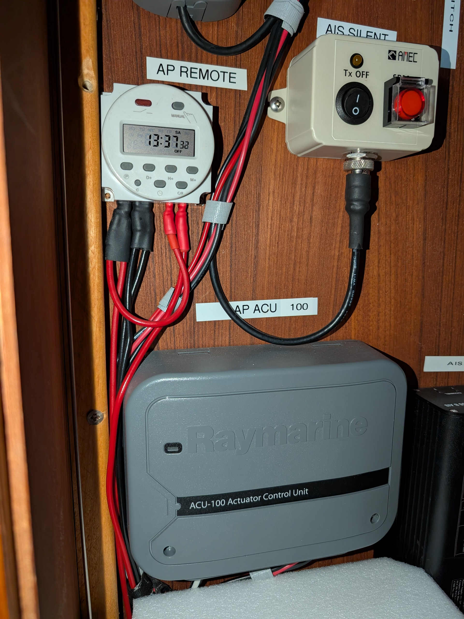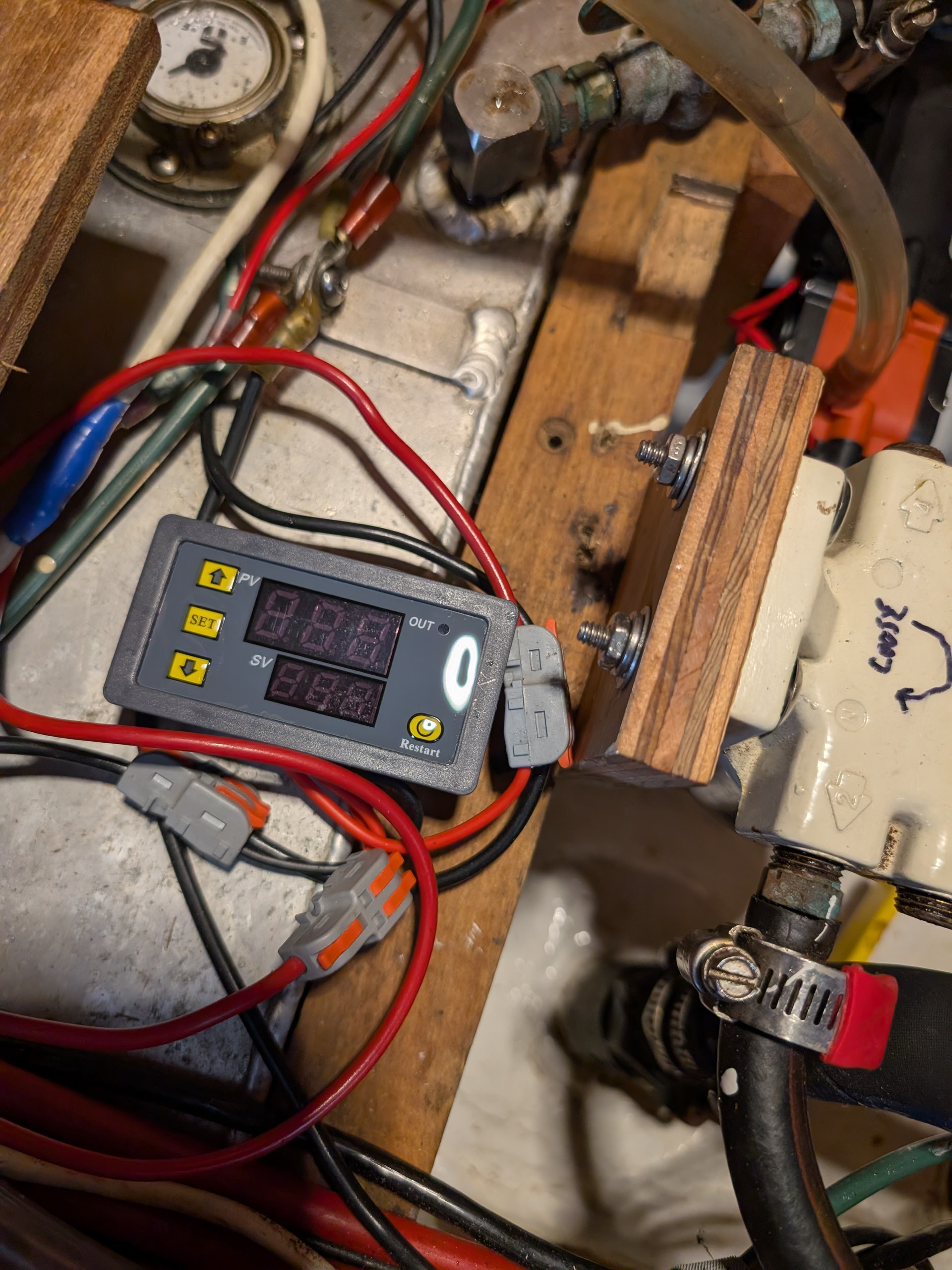 The final pic shows my long term timer. I usually turn this on continuous duty underway. While the cycle timer takes over for shorter intervals of pump activation. When at anchor or dock I can set this to turn the pump on once an hour up to once a week. I do get a little shaft leakage when I stop the boat. It eventually stops leaking after a couple of days so I use this to clear that little bit and then deactivate it completely.