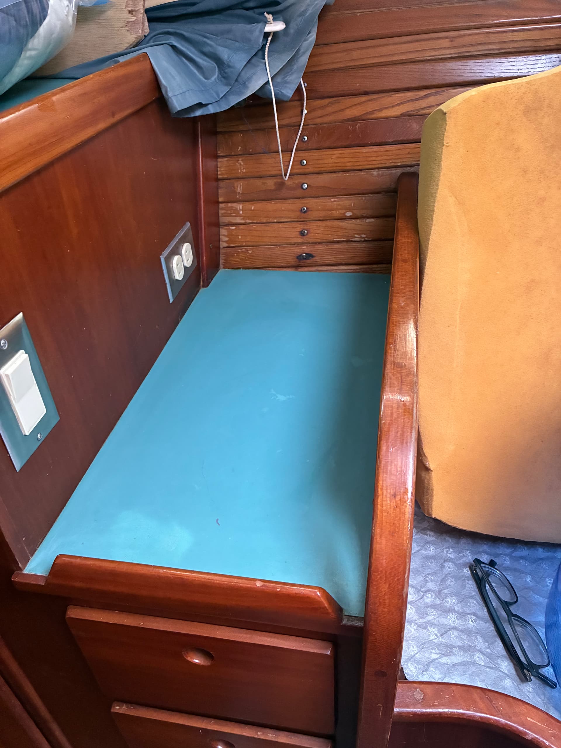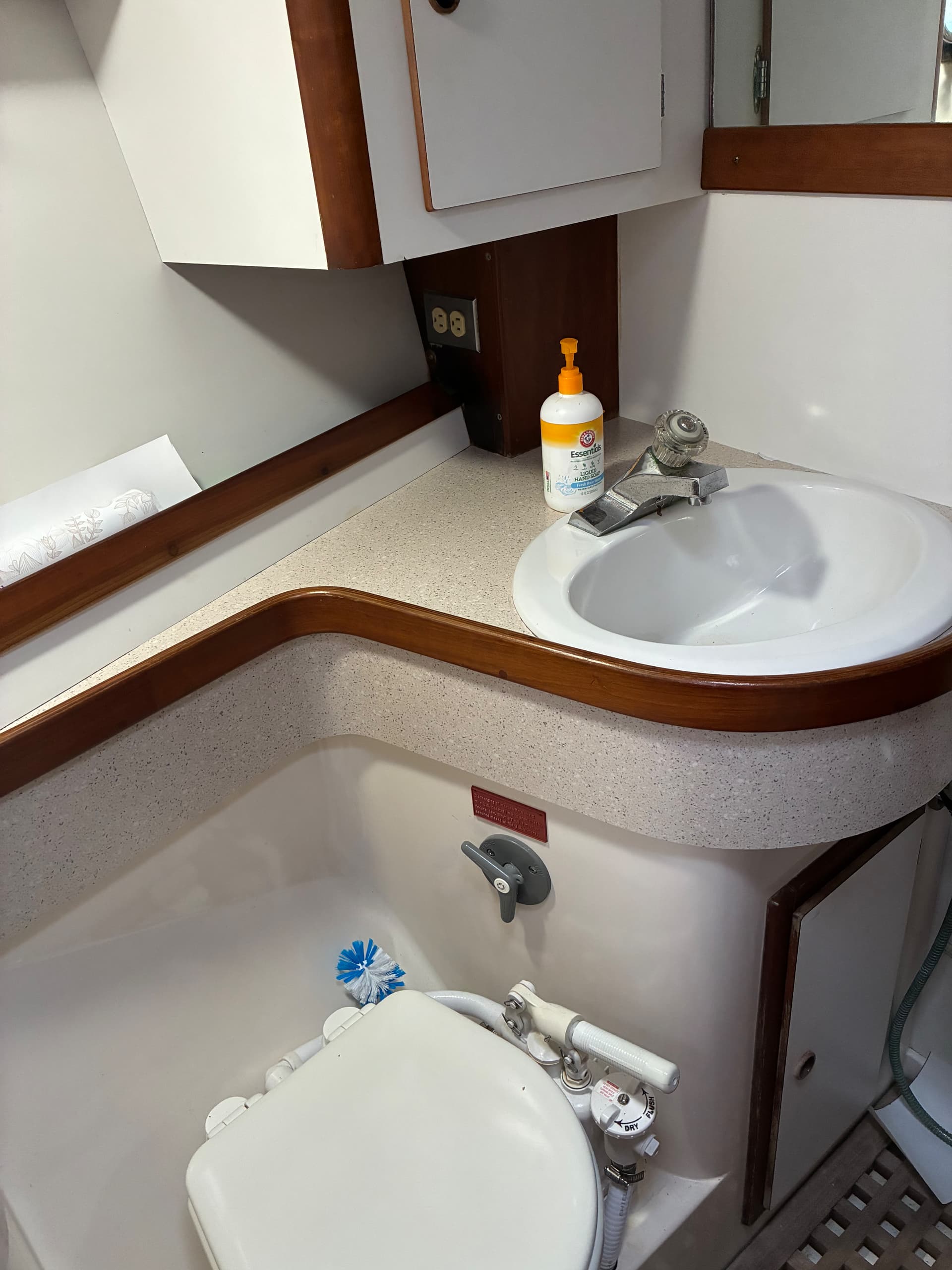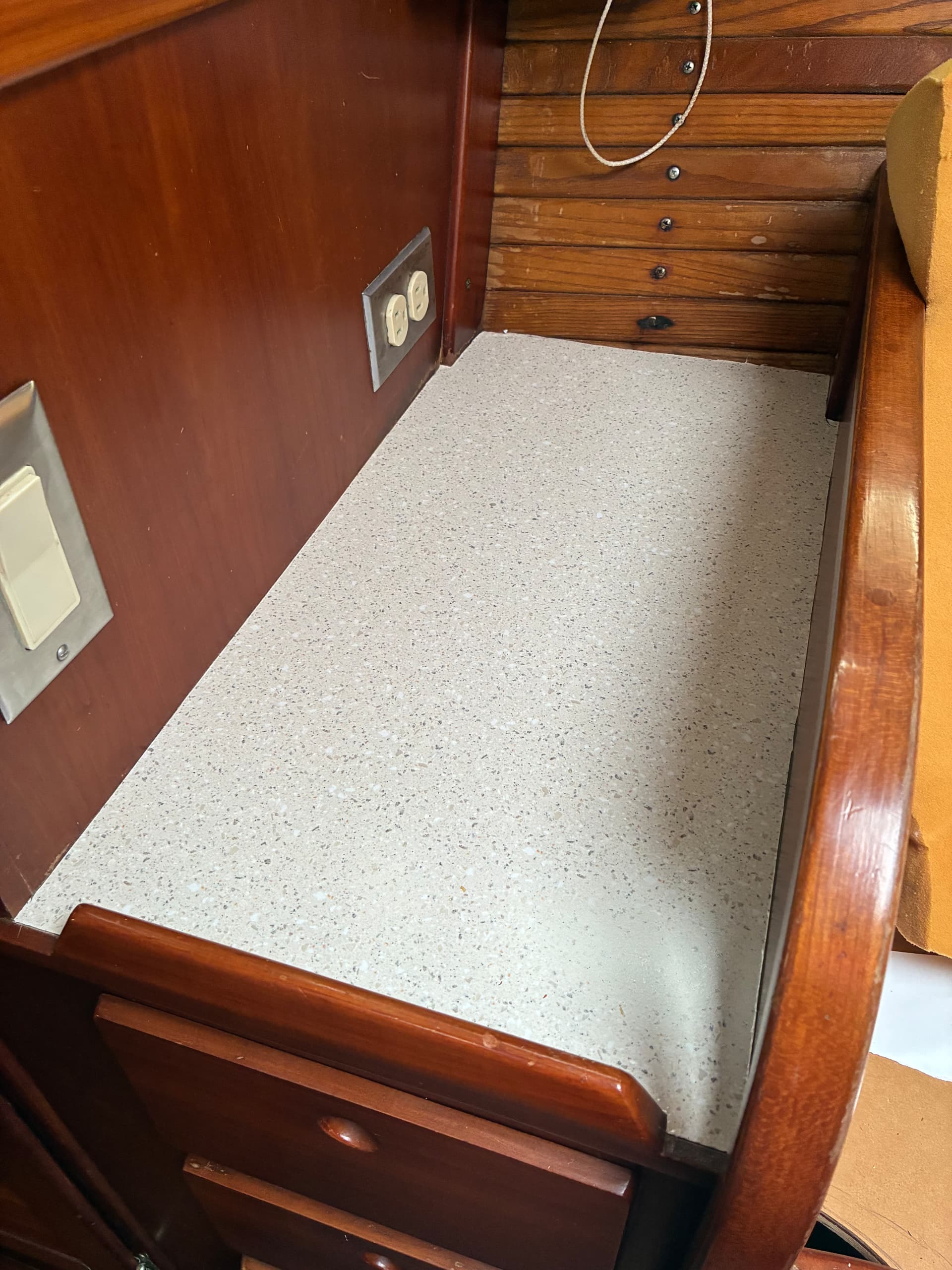 Just wanted to show off my handiwork from this weekend on our Freedom 45. The one thing I disliked about this boat when we purchased her about a year ago was the color of the countertops. Thinking i could live with it I soon realized I could not. It wasn’t just the color but the stains and such that drove me crazy. So I started to change that this weekend. I forgot to take a before pic of the head but if you have one you know. Next time I would take out the sink just to make my life easter